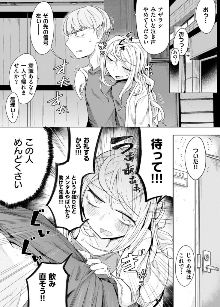 そんな彼女が、ある日、一回り年下のバイト先の先輩(大学生)と飲みに行くことになります。先輩の前で泥酔し、結婚への焦りや彼氏がいない寂しさを暴力とともにぶつけてしまうという大失態を演じます。