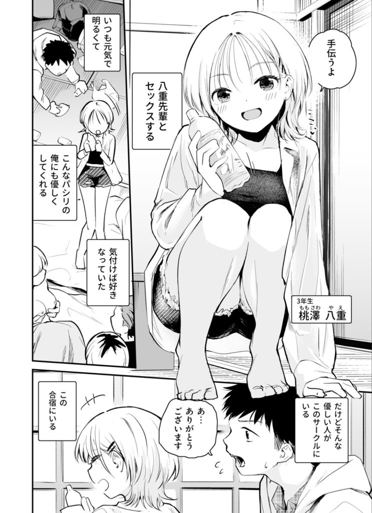 物語の舞台は、ある大学のサークル。そこには、選ばれた一部のメンバーだけが参加を許される伝説の「乱交合宿」が存在しました。主人公は、密かに憧れている先輩・桃澤八重(ももざわ やえ)とSEXしたい一心で、屈辱的なパシリとしてその合宿に潜り込みます。しかし、現実は非情でした。先輩たちから蔑まれ、バカにされ、ついには合宿所から追い出されそうになります。しかし、その時、予想だにしない奇跡が起こります。なんと、会場にいた他の男たちが急用やアクシデントで全員いなくなり、残されたのは主人公と、欲求不満を抱えた美少女たちだけという、夢のような状況が訪れたのです。